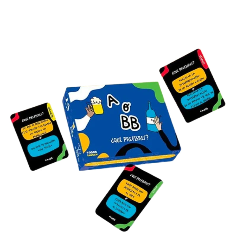 ¿Prefieres arriesgarte o jugar a lo seguro? En A o BB, cada carta te presenta dos opciones y deberás decidir cuál tomar. Ya sea votando en grupo o enfrentando un reto, este juego llevará la fiesta a otro nivel. ¿Tienes lo necesario para elegir y sobrevivir? 🍹😆